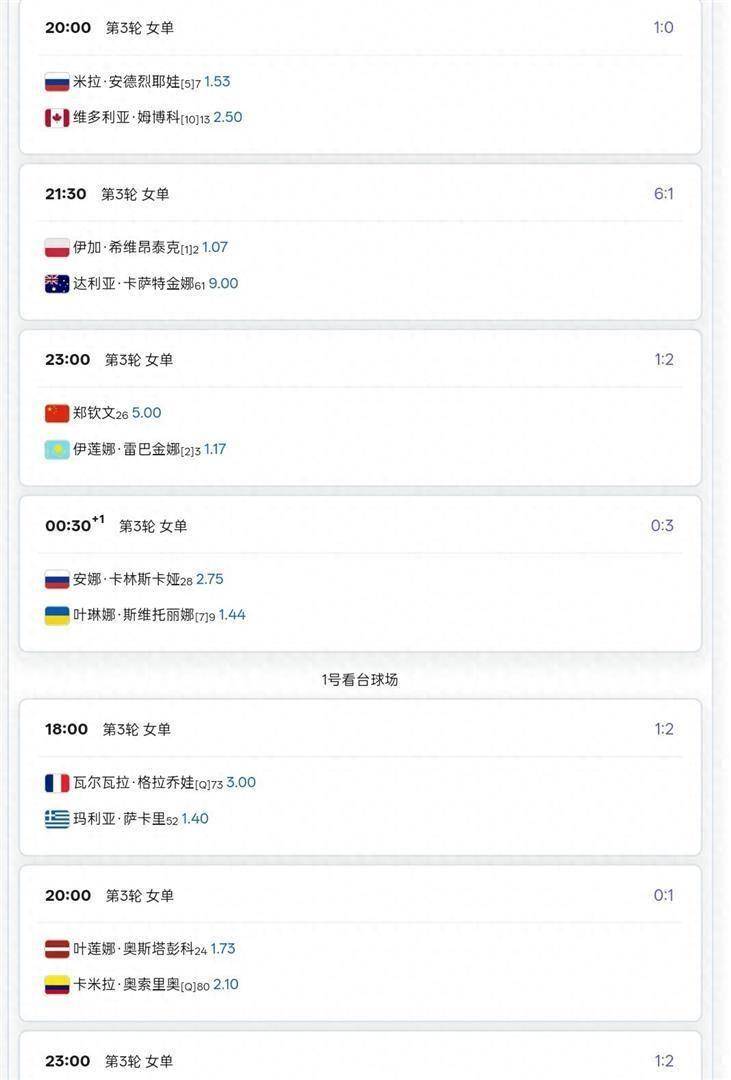 比赛的背景板上写着清晰的数字。在各大机构开出的赔率中,莱巴金娜获胜的赔率低至1赔1.17,而郑钦文获胜的赔率则高达1赔5.00左右。这是一组差距悬殊的数字,直观地反映了外界对这场比赛胜负的普遍预测。 莱巴金娜被极度看好,而郑钦文则扮演着挑战者的角色。
