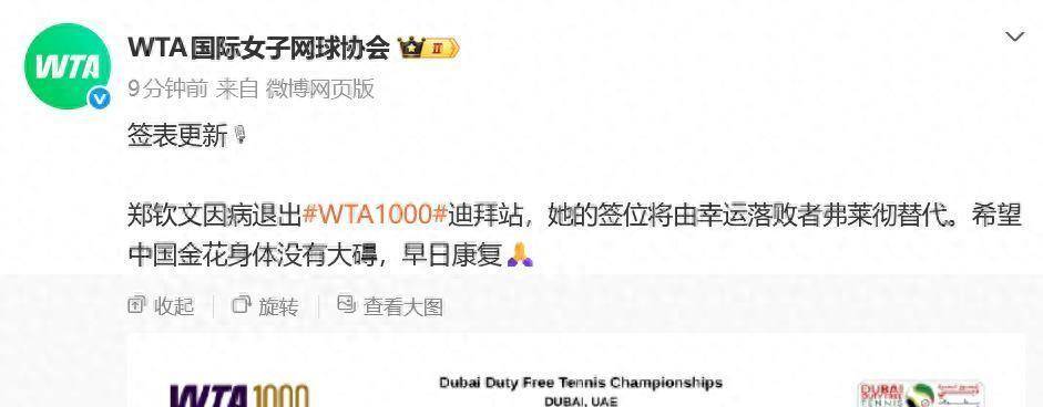 可就在球迷们准备看这场“复仇战”的时候,WTA官网冷不丁弹出一条消息:郑钦文因病退出本届迪拜站比赛,她的签位将由幸运落败者弗莱彻顶替。